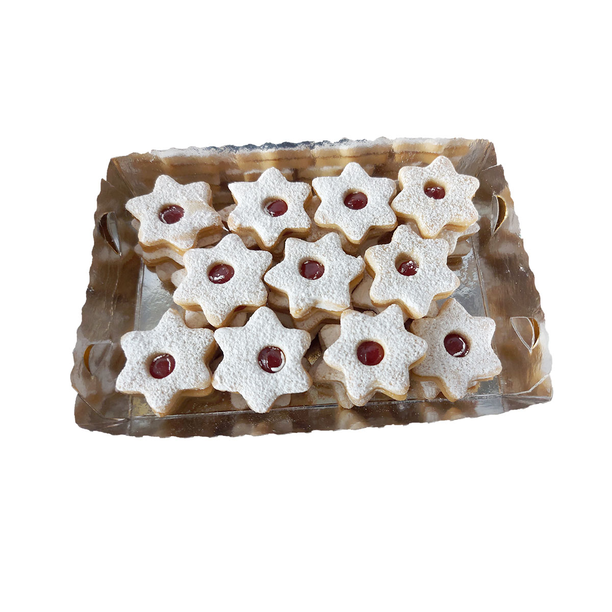 Unsere Linzersterne verbinden zarten Mürbeteig mit feinster Marmeladenfüllung und einem Hauch von Puderzucker.